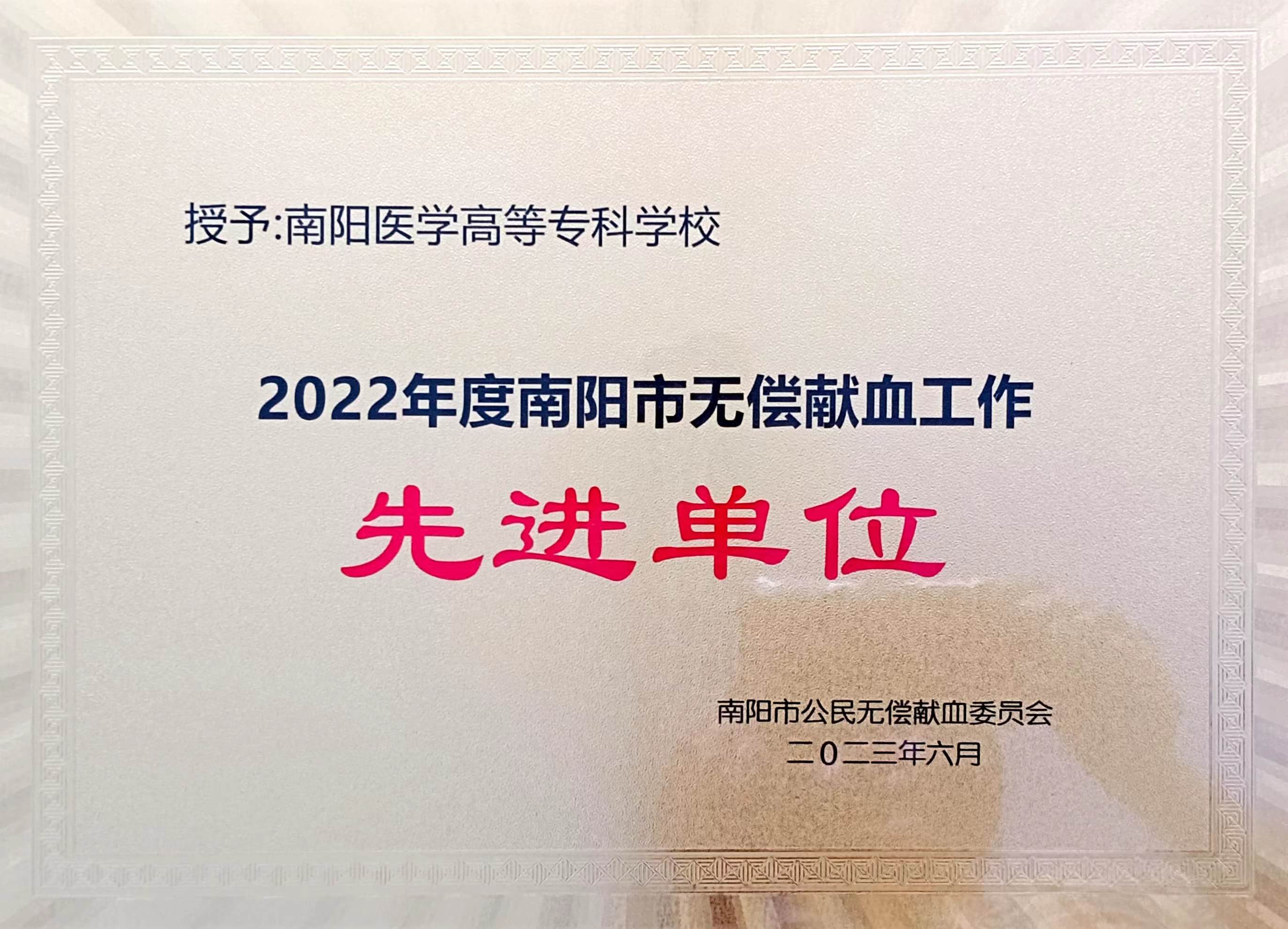 本网讯(文/学生处 闫珂)6月8日下午,南阳市庆祝2023年6·14世界献血者日暨无偿献血工作会议在南阳宾馆5号楼3楼会议室举行。市卫健体委党组书记李芳、市政府副秘书长李菡等出席会议,会议对2022年参与无偿献血工作的先进集体和先进工作者进行表彰,我校荣获“2022年度南阳市无偿献血工作先进单位”荣誉称号。