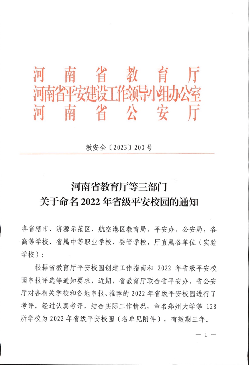 本网讯(文/法制办 刘一凡)近日,河南省教育厅印发《河南省教育厅等三部门关于命名2022年省级平安校园的通知》,授予我校省级“平安校园”称号。
