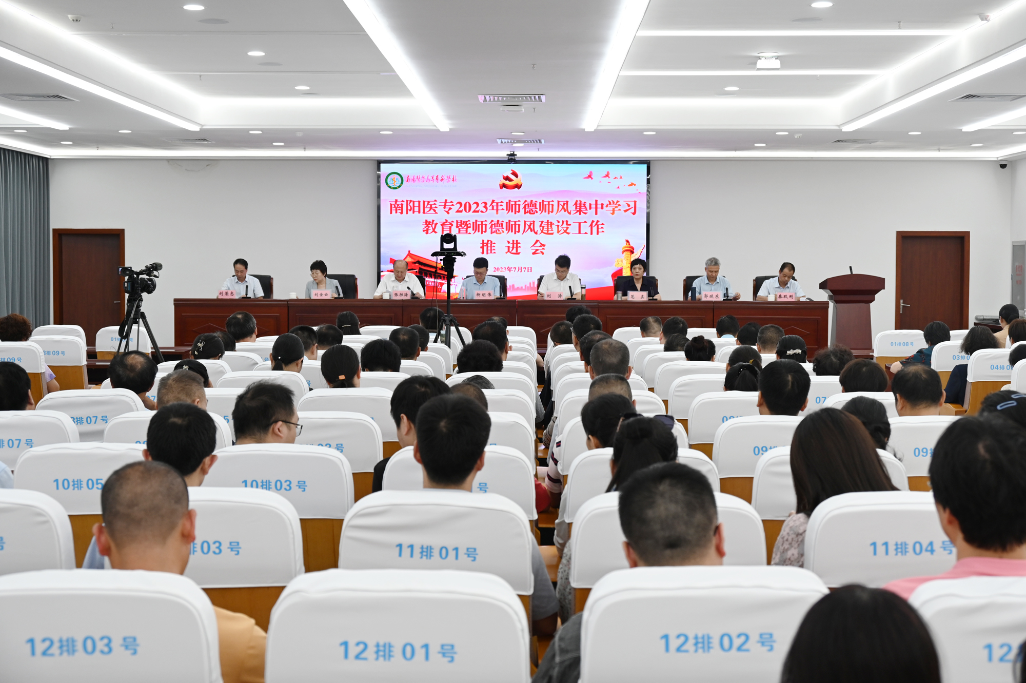 本网讯(文/教务处 梁亮)7月7日下午,我校在仲景文化中心召开2023年师德师风集中学习教育暨师德师风建设工作推进会。学校领导班子成员出席会议,校本部全体教职工、后勤服务人员代表、三所附属医院相关负责同志参加会议。会议由学校党委副书记刘涛主持。
