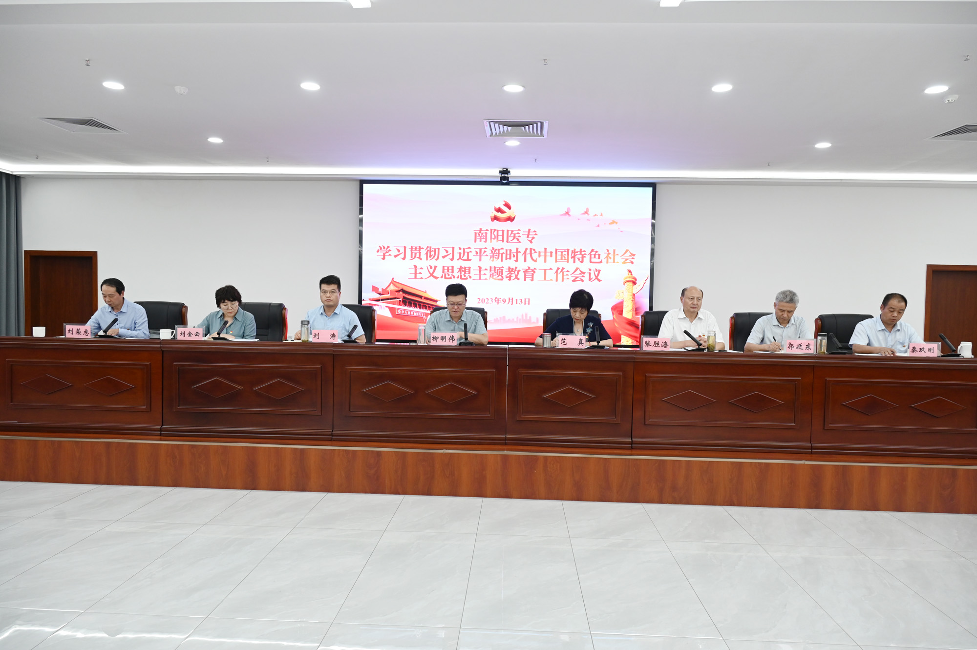 本网讯(文/宣传部 李峰松 张旭斌)9月13日下午,我校在仲景文化中心会议室,隆重召开学习贯彻习近平新时代中国特色社会主义思想主题教育工作会议。校领导柳明伟、范真、刘涛、张胜海、刘金云、郭延东、刘荣志、秦玖刚出席会议,校本部全体副科级以上领导干部,各基层党组织教师党支部、学管党支部书记,二、三附属医院书记、院长参加会议。党委书记柳明伟作重要讲话,校长范真主持会议。