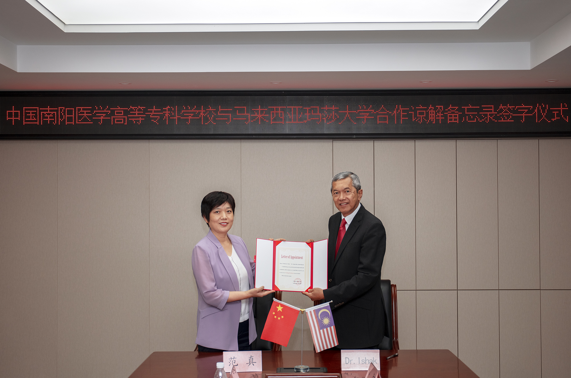 双方举行合作洽谈会。校长范真对来访团一行表示热烈的欢迎,介绍了我校基本情况,并就中外合作办学项目、仲景文化交流、非遗技术海外培训等项目做了详细说明。拿督依沙克介绍了玛莎大学的基本情况,表示愿意与我校在口腔医学专业合作办学、师生交流、特别是在玛莎大学建立仲景健康文化中心等方面进行进一步合作。随后,双方举行了合作备忘录签字仪式。我校聘请拿督依沙克博士和拿督易卜拉欣博士为我校客座教授,范真为他们颁发了聘任证书。