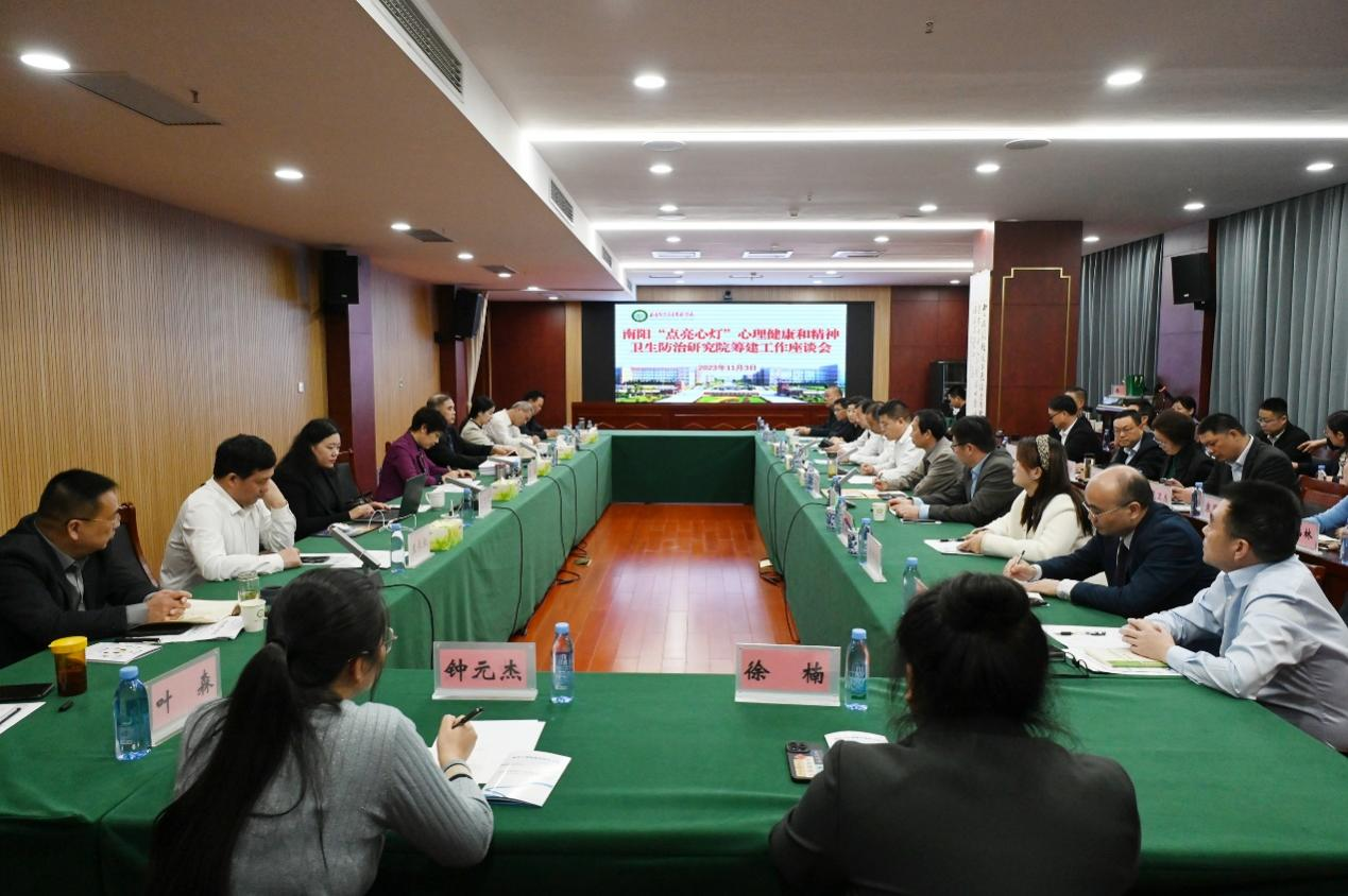 本网讯(文/学生健康服务与心理咨询中心 李孟辉)11月3日上午,南阳“点亮心灯”心理健康和精神卫生防治研究院筹建工作座谈会在南阳医专仲景文化中心610会议室隆重召开,国家心理健康和精神卫生防治中心社区康复指导部副主任李传旭亲临会议,河南省心理协会理事长王长虹,南阳市政法委副书记杨松林,南阳市政协常委冯瑛剑,南阳市卫健体委副主任宋万新,南阳市妇联副主席、南阳市委组织部党员教育中心科长叶森,共青团南阳市委四级调研员李敬卓,洛阳烧伤医院董事长肖建勋及南阳市第四人民医院、河南艾仲医健康管理有限公司、众悦(南阳)科技有限公司、南阳市儒林置业有限公司等省内多家医院、企业负责人,南阳医专校长范真,党委副书记刘涛,副校长刘荣志、秦玖刚出席会议,学校各相关部门(单位)负责人与会。座谈会由刘涛主持。