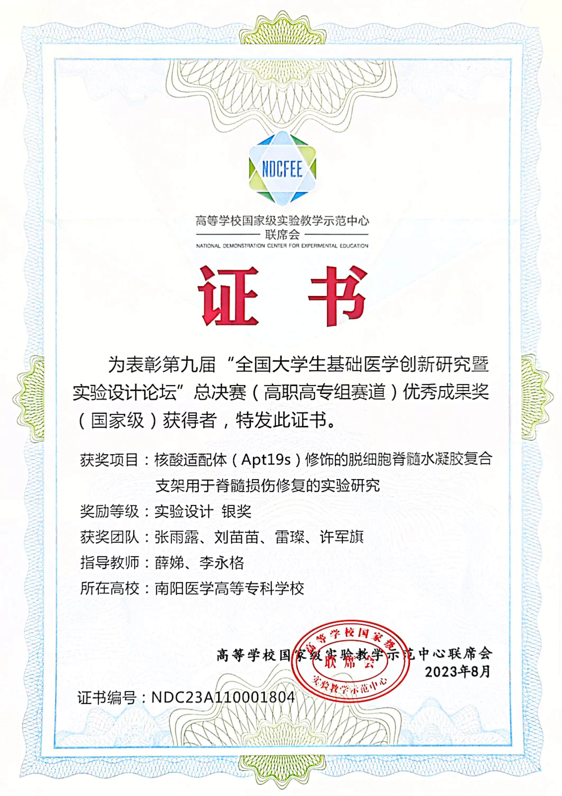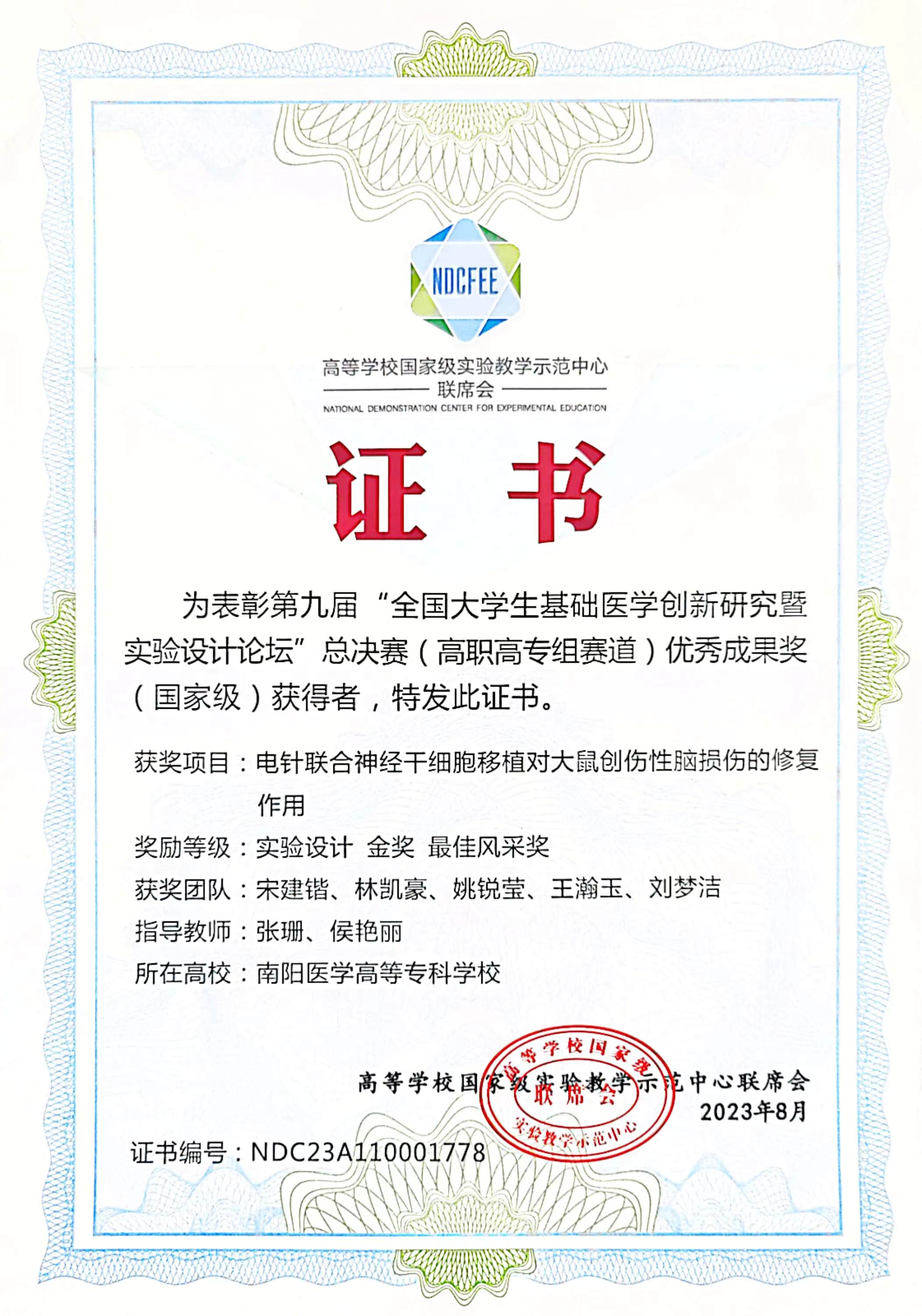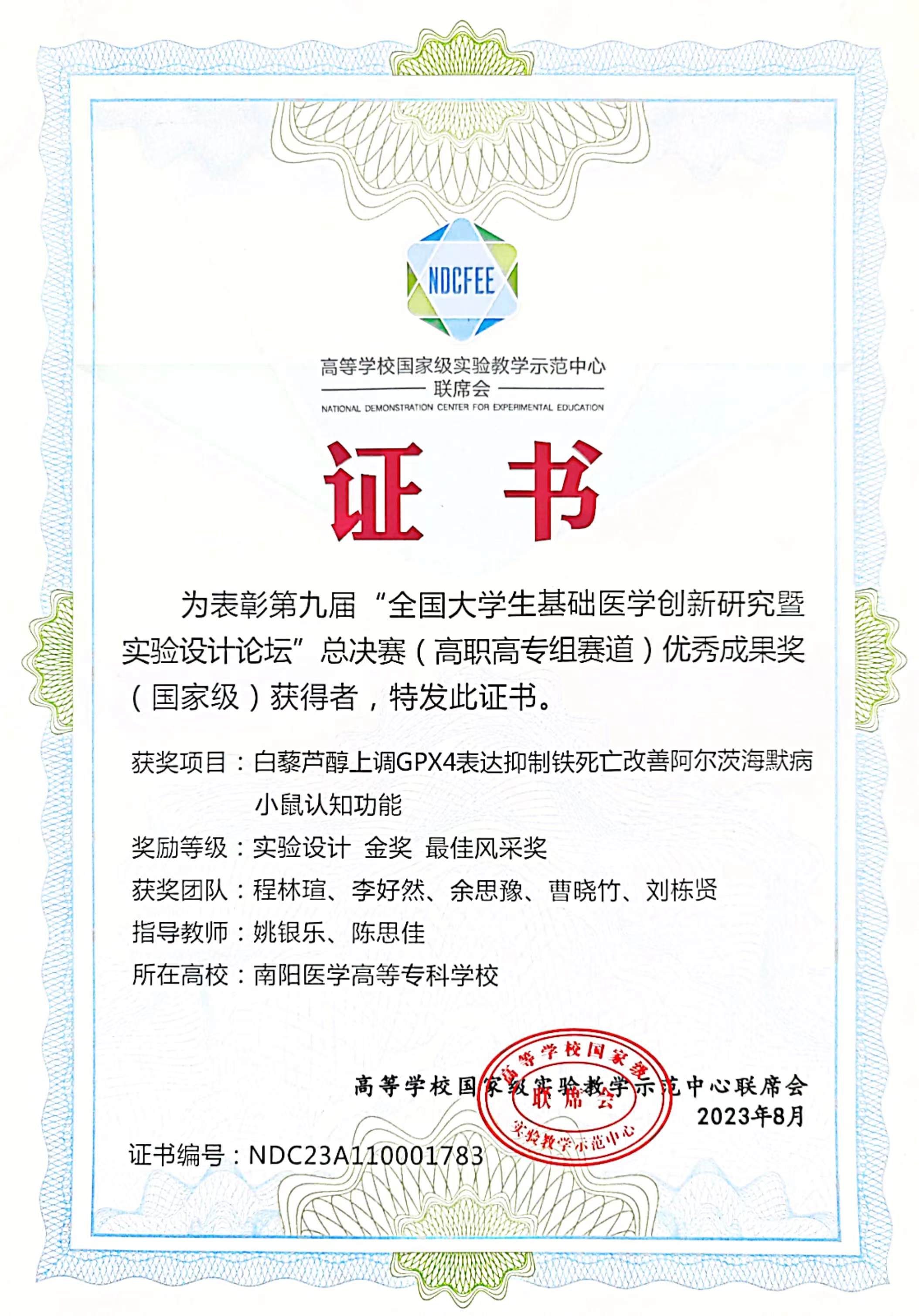 本网讯(文/基础医学部 姚银乐)在第九届全国大学生基础医学创新研究暨实验设计论坛总决赛中,我校再获佳绩。基础医学部姚银乐、陈思佳团队,康复医学系张珊、基础医学部侯艳丽团队荣获金奖、最佳风采奖和“优秀指导教师”荣誉称号;基础医学部薛娣、李永格团队荣获银奖。与第七届比赛获得的银奖1项、第八届比赛获得的金奖、银奖各1项相比,本次大赛成绩取得显著的提升,创历史参赛最佳成绩。