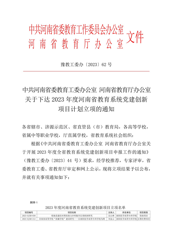 本网讯(文/临床医学系 王静)近日,中共河南省委教育工委办公室、河南省教育厅办公室下发2023年度河南省教育系统党建创新项目计划立项的通知,我校《校地党建结对帮扶助力乡村振兴长效机制研究》和《河南省高等学校“清廉学校”建设研究——以博鱼官方网站,博鱼BOYU(中国)为例》两个项目获批立项。
