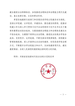 本网讯(文/法制办 田秀芳)近日,省教育厅下发《关于公布首批新时代依法治校示范校名单的通知》,经过各高校自愿申报、专家评审、网络答辩、实地抽查、征求意见、综合评议和公示等环节,全省19所高校入围(本科15所,高职高专4所),学校获评“河南省首批新时代依法治校示范校”荣誉称号。