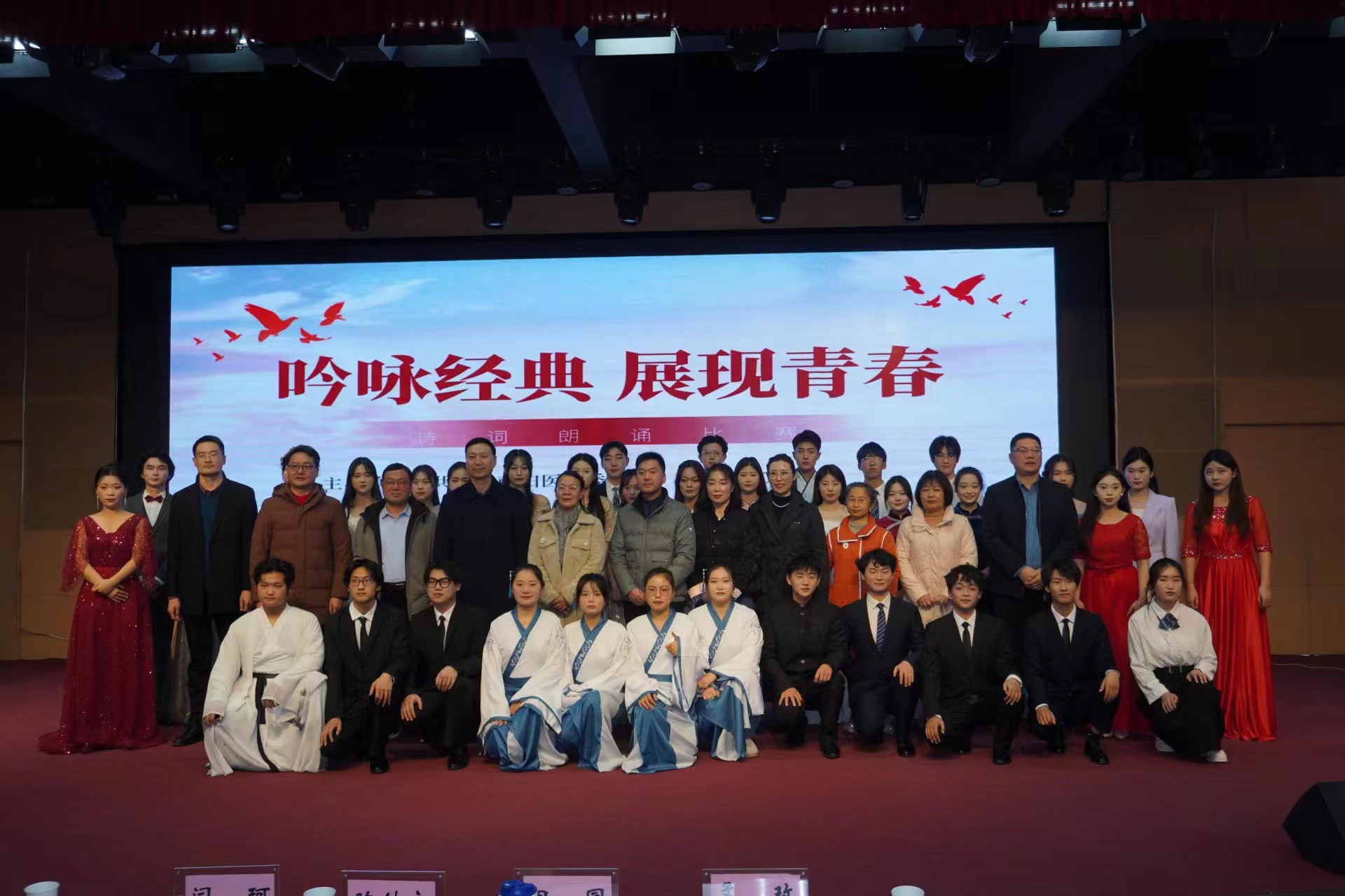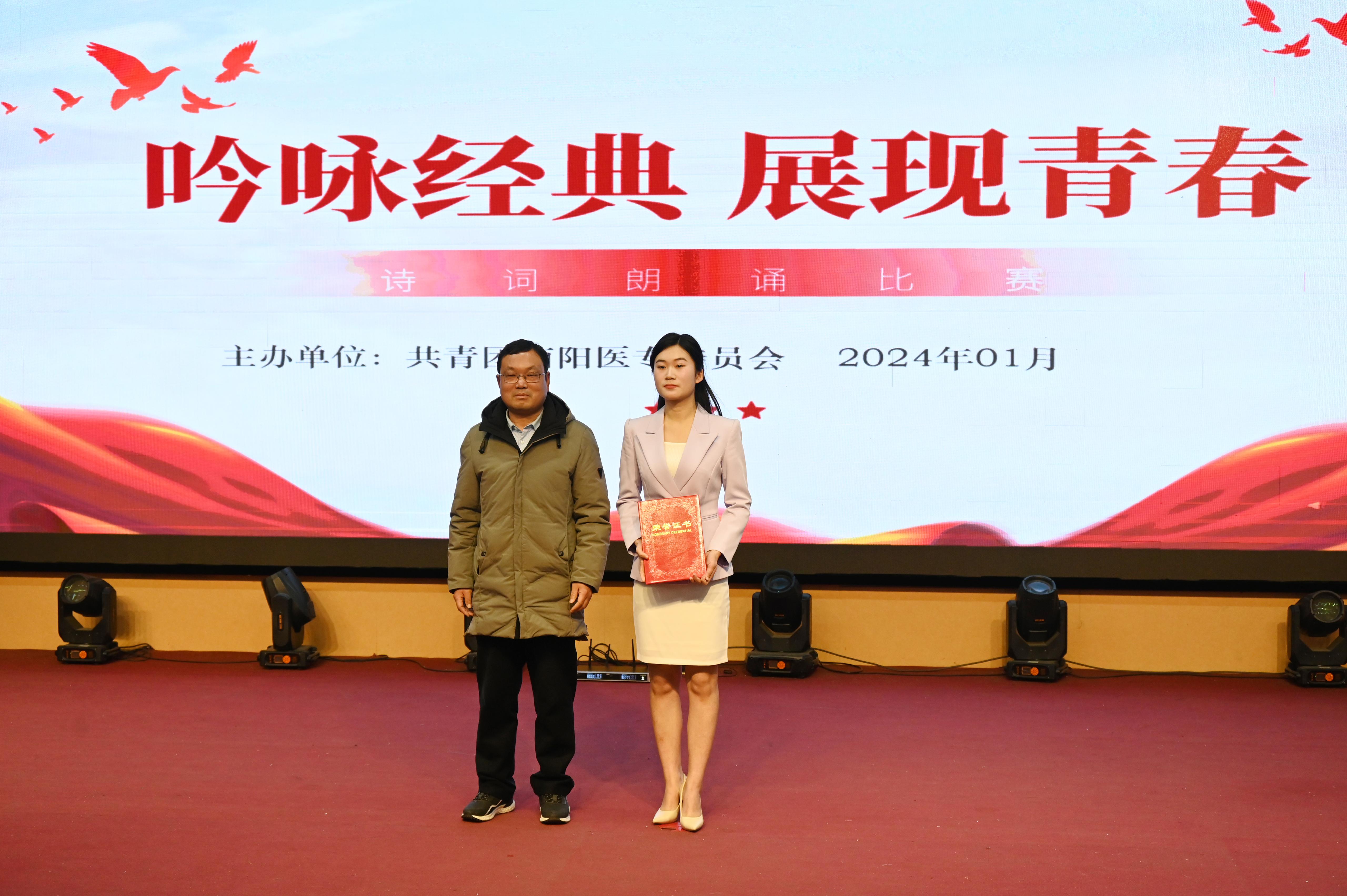 比赛现场气氛热烈,选手们慷慨激昂,诠释了对诗词的理解和热爱。经过激烈角逐,最终护理系《满江红》获得一等奖;临床医学系《将进酒》、药学系《红船》获得二等奖;口腔医学系《春江花月夜》、护理系《中国话》、国际教育学院《莫等闲 常挥旗》获得三等奖;护理系团总支、国际教育学院团总支获得优秀组织奖。