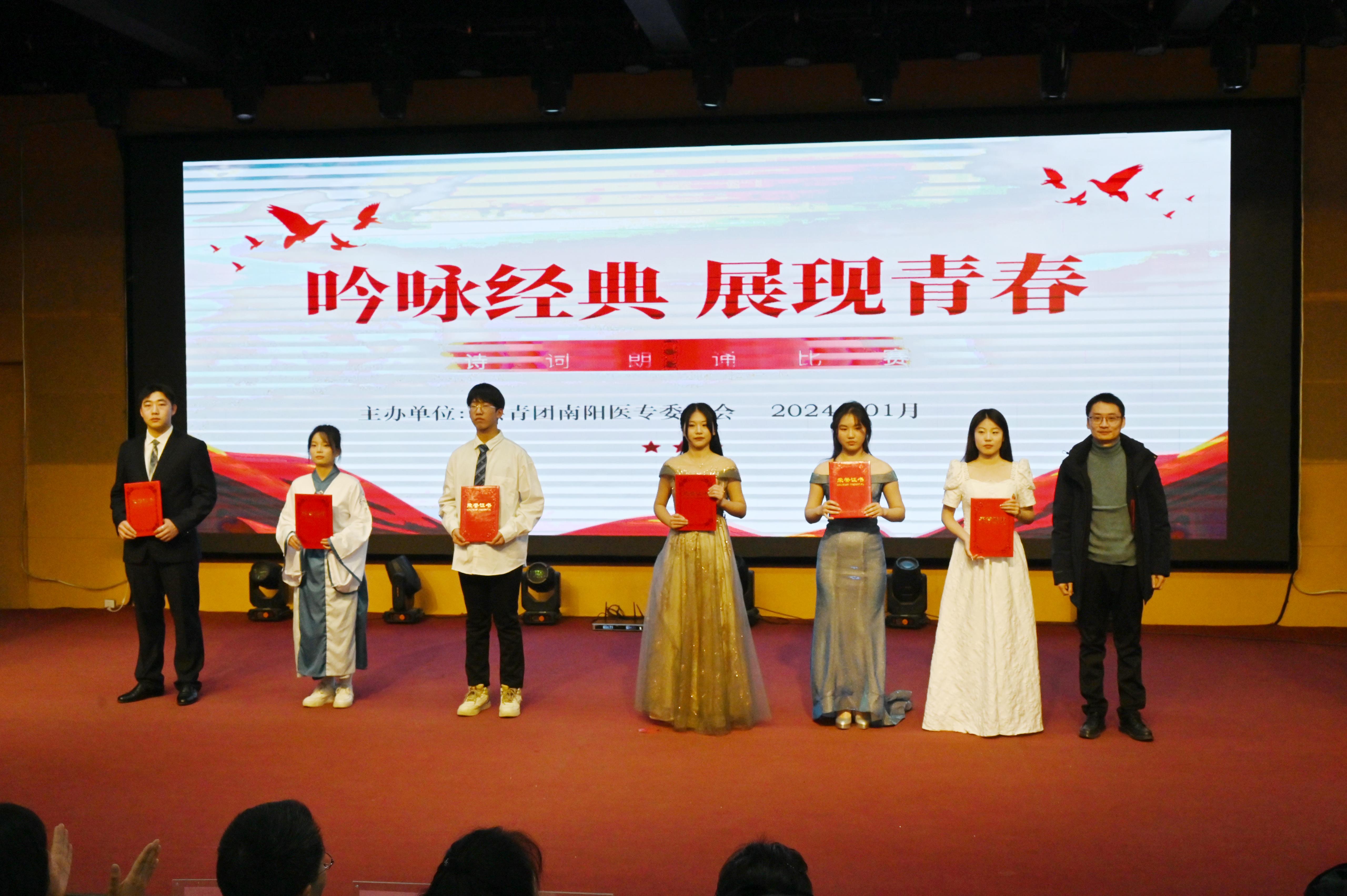 本网讯(文/校团委 马黎莉)1月3日下午,南阳医专“吟咏经典 展现青春”诗词朗诵大赛在仲景东区礼堂二楼报告厅隆重举行。校党委委员、工会主席杜晓平、宣传部部长李红普、工会副主席库建伟、就业创业处处长刘鹏、团委刘怀东及各系(院)党总支书记出席了本次活动。