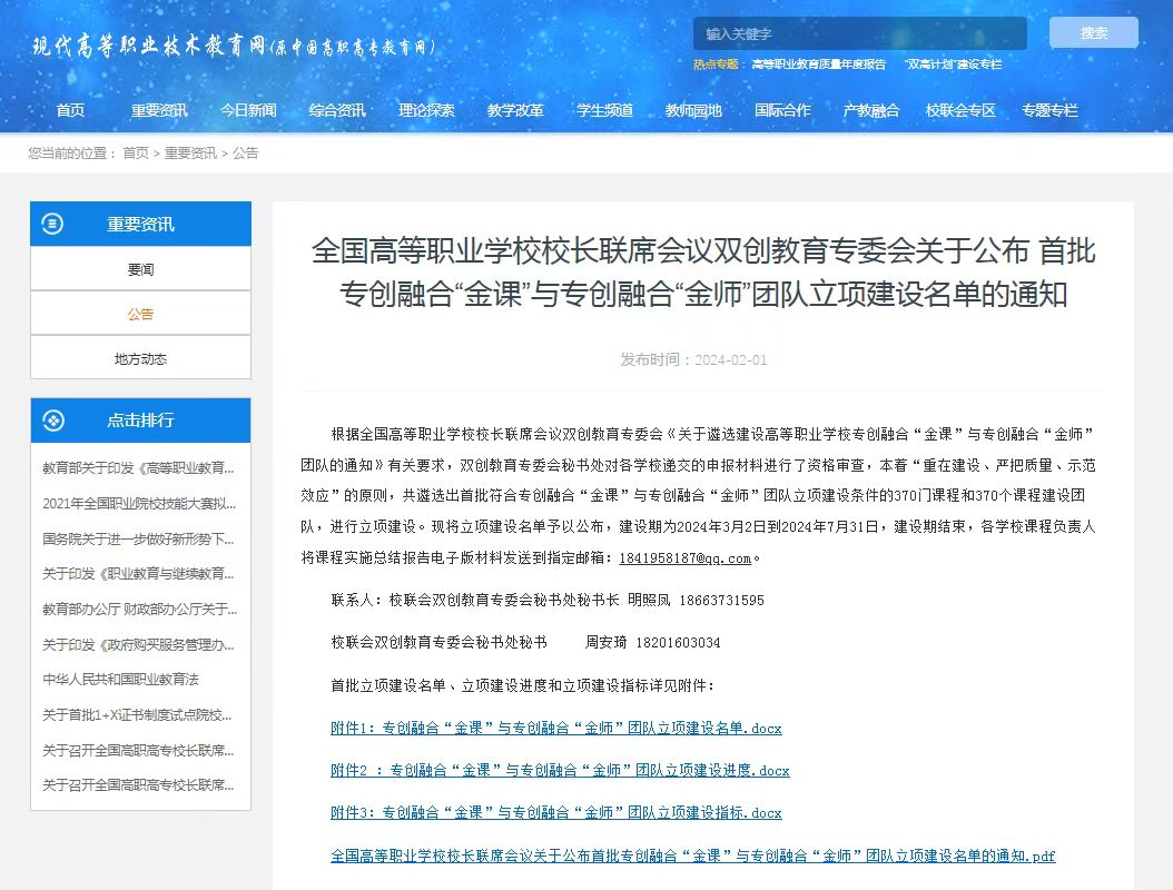据悉,此次遴选是由全国高等职业学校校长联席会议双创教育专委会主办,旨在贯彻落实《国务院办公厅关于深化高等学校创新创业教育改革的实施意见》和《国务院办公厅关于进一步支持大学生创新创业的指导意见》文件精神,推进“金专业、金课程、金师资、金基地、金教材”的“五金”建设,做实双创教育,聚焦专业群课程内涵升级、教学资源建设、双创项目产出、科研成果转化、教师能力提升和教学模式创新,将双创教育与专业教育有机融合并贯穿人才培养全过程,提高学生就业创业的适应力、胜任力,提升师生的家国情怀、责任担当和国际视野。