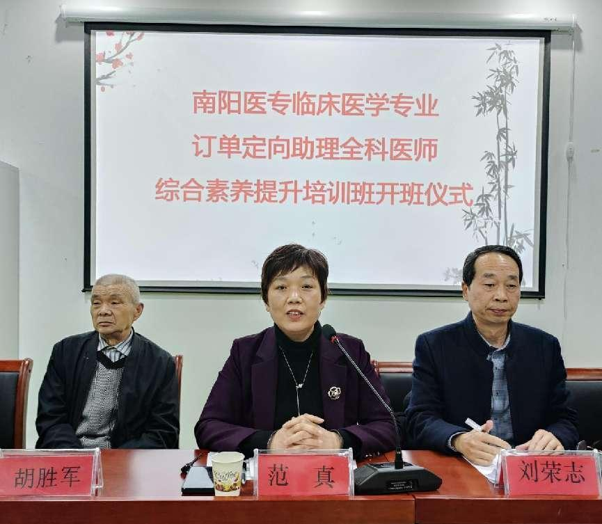 范真在讲话中强调了本次培训班开班的三个不易:第一,开办实属不易。我校订单定向临床医学专业开创了河南省的先河,从申请到开设历经艰辛;第二,人才培养方案制订来之不易。围绕“小病善治,大病善识,重病善转,慢病善管”这一目标,设定了6年贯通式订单定向助理全科医师人才培养周期,实行“2121”人才培养模式;第三,学习机会来之不易。学校在不影响正常教育教学的情况下,组织相关教师进行集中培训授课,对于同学们来说机会来之不易。她希望同学们遵守校纪校规,勤学善思,学有所获;立下宏愿,扎根基层,为地方百姓服务,脚踏实地,求真务实,小岗位大作为,为推动南阳基层医疗卫生健康事业发展,为助力健康中国建设和乡村振兴作出积极贡献。