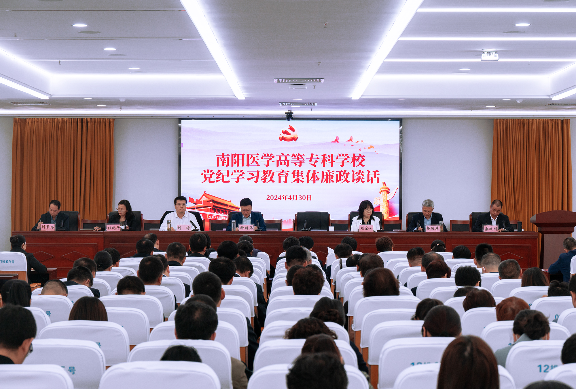 本网讯(文/纪委办 李冰)4月30日上午,我校在仲景东区文化中心719会议室召开党纪学习教育集体廉政谈话会议。学校全体领导班子成员、校本部中层干部、三所附属医院班子成员参加会议。