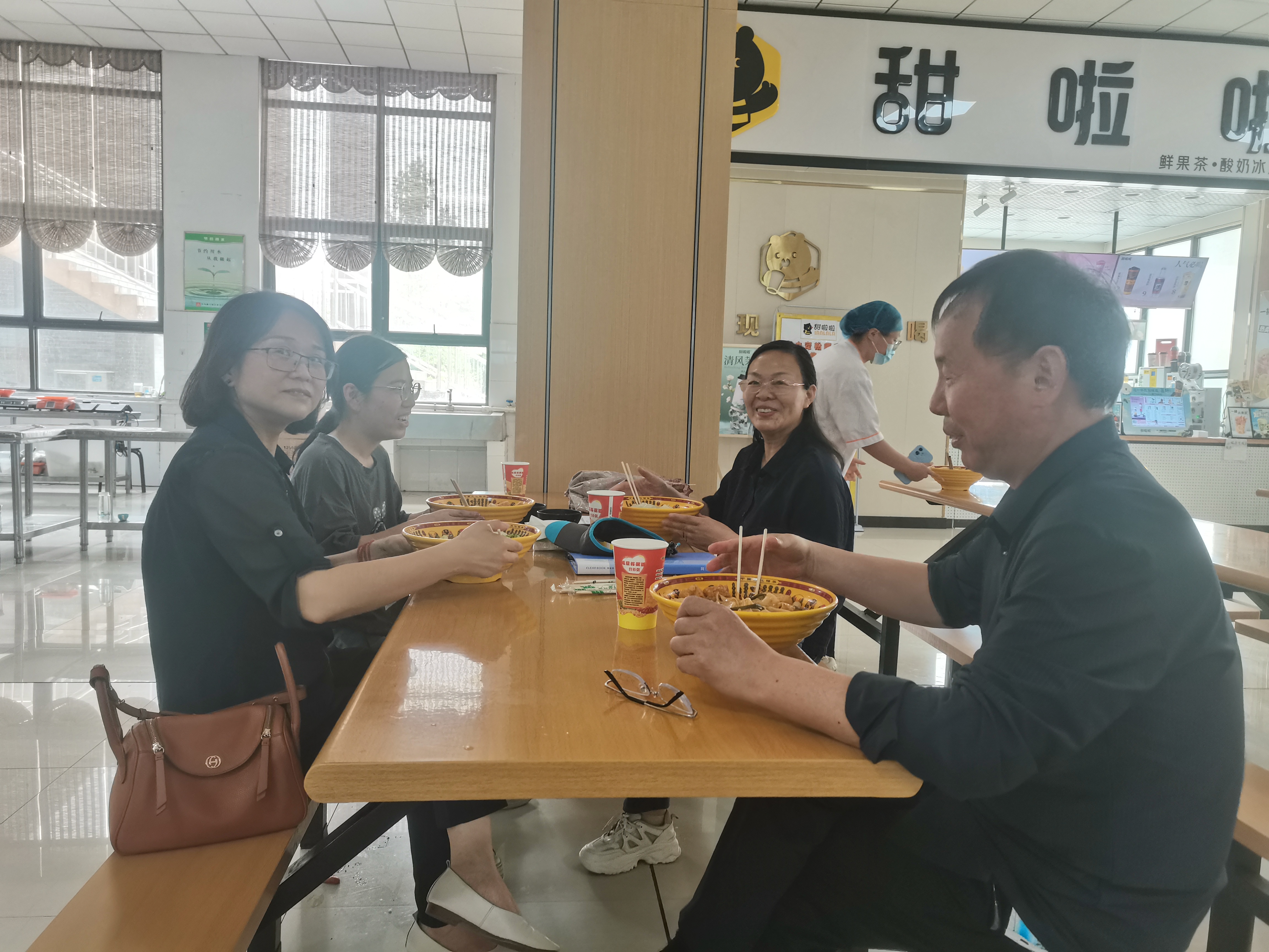 5月27日中午,杜主席与药学系领导、专业带头人张琳和所联系学生王丹阳在仲景东区学生餐厅共进午餐,共话美好未来。(编审/李峰松 摄影/蒋晓涵)