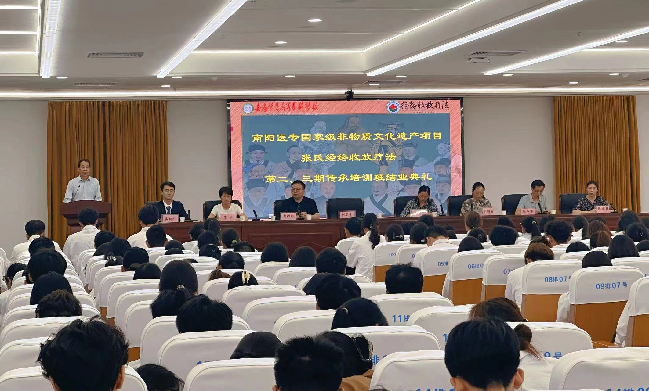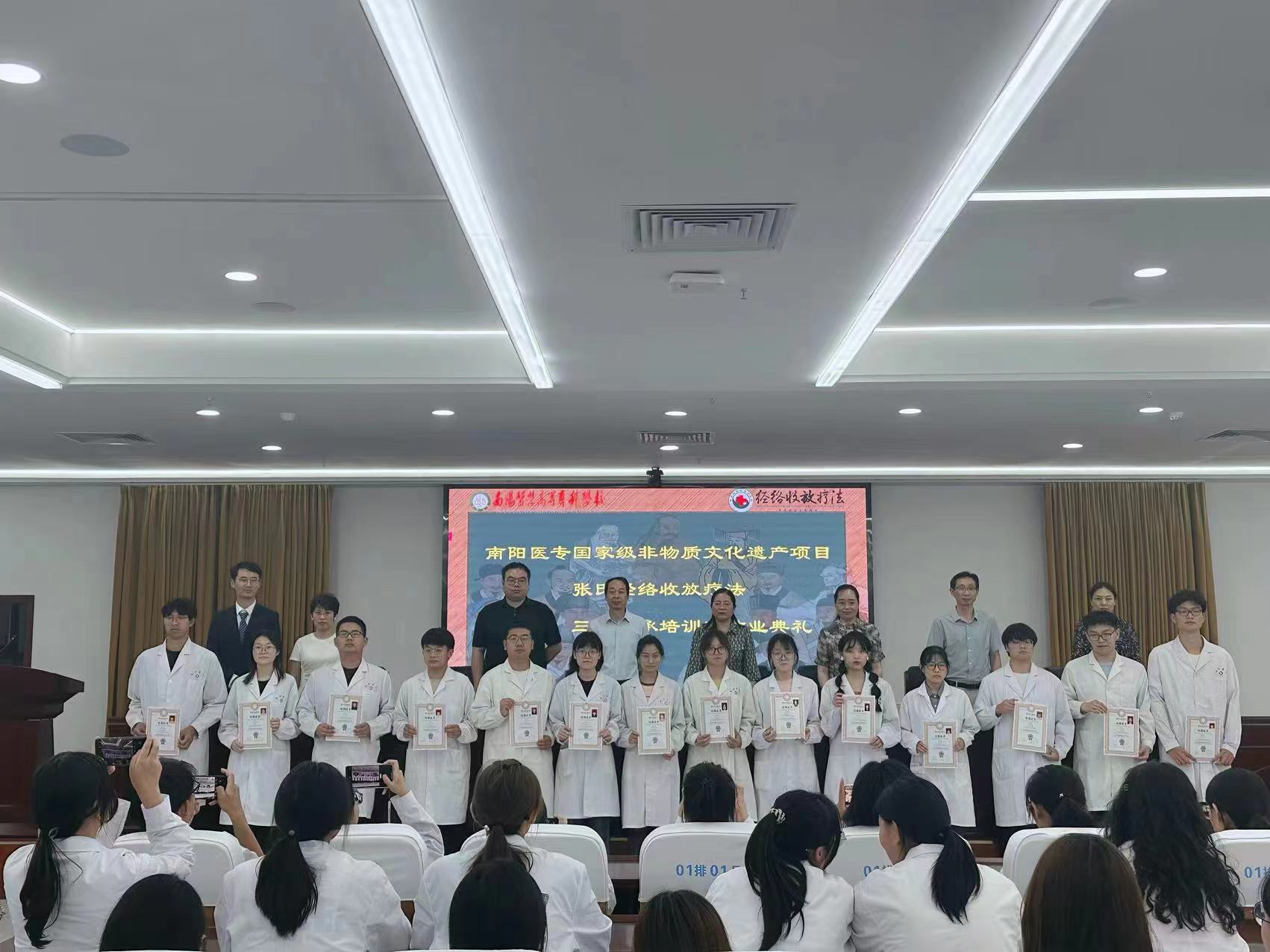 本网讯(文/中医系 王翘楚)5月25日,国家级非遗项目张氏经络收放疗法第二、三期传承班结业典礼暨技艺展演活动在仲景文化中心719会议室举行。副校长刘荣志,康复系、临床系、中医系、经络收放疗法传承人郭仁昭老师及300余名学员参加典礼。典礼由中医系主任张明丽主持。