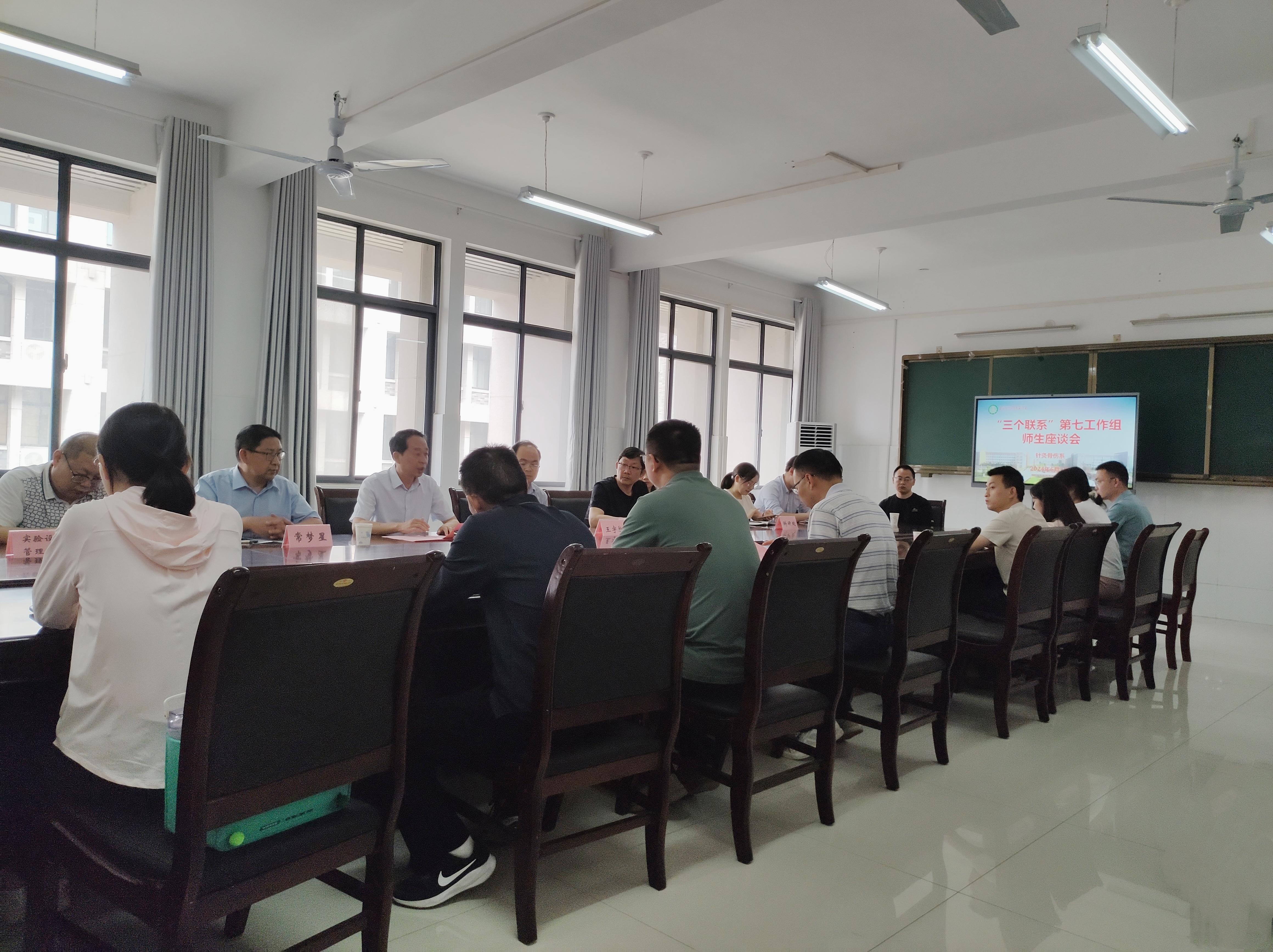 本网讯(文/针灸骨伤系 张羽东)为深入贯彻落实学校“三个联系”工作制度,落实党纪学习教育常态化制度化要求。6月3日下午,校党委委员、副校长刘荣志带领“三个联系”第七工作组深入针灸骨伤系与联系师生进行面对面座谈,教务处、科研处、实验设备管理中心联系干部,针灸骨伤系领导班子成员、全体辅导员班主任和学生代表参加座谈。会议由针灸骨伤系党总支书记毕跃忠主持。