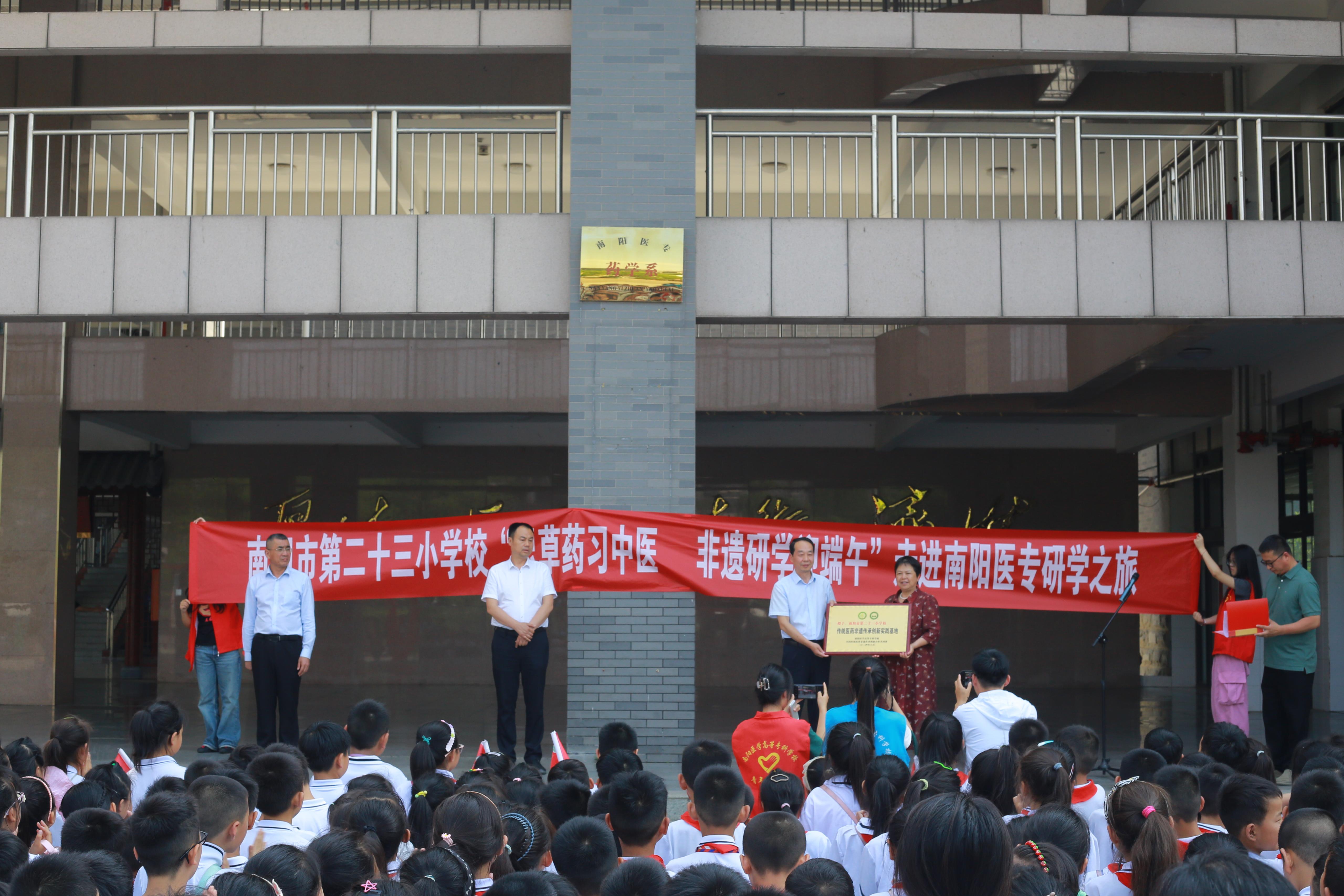 刘荣志代表南阳医专及全国传统医药非遗传承创新合作共同体向第二十三小学授予“传统医药非遗传承创新实践基地”牌。