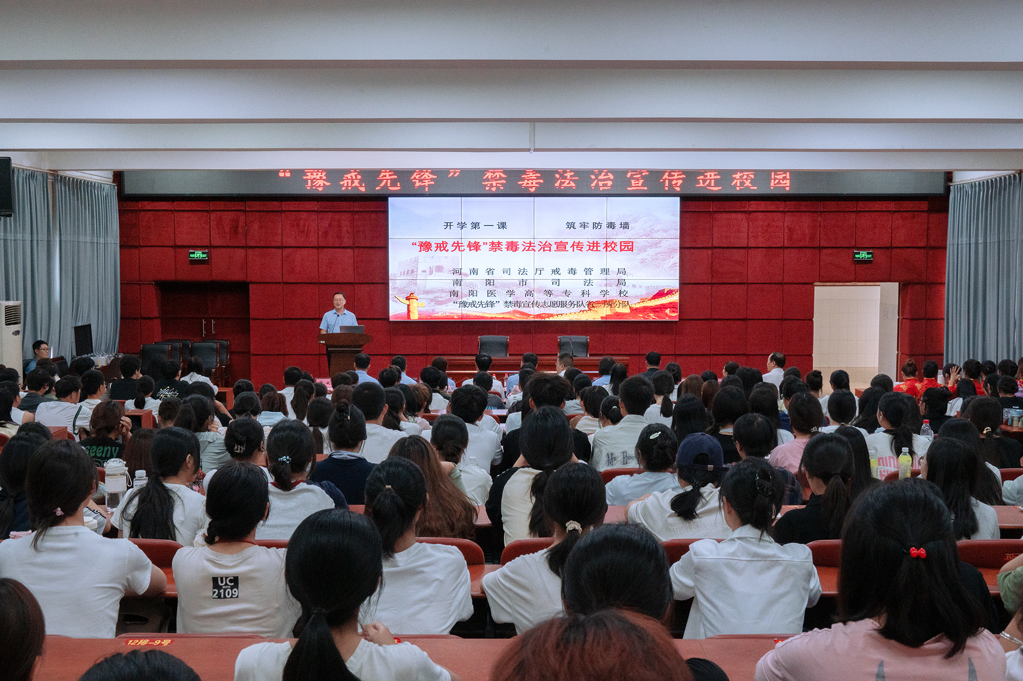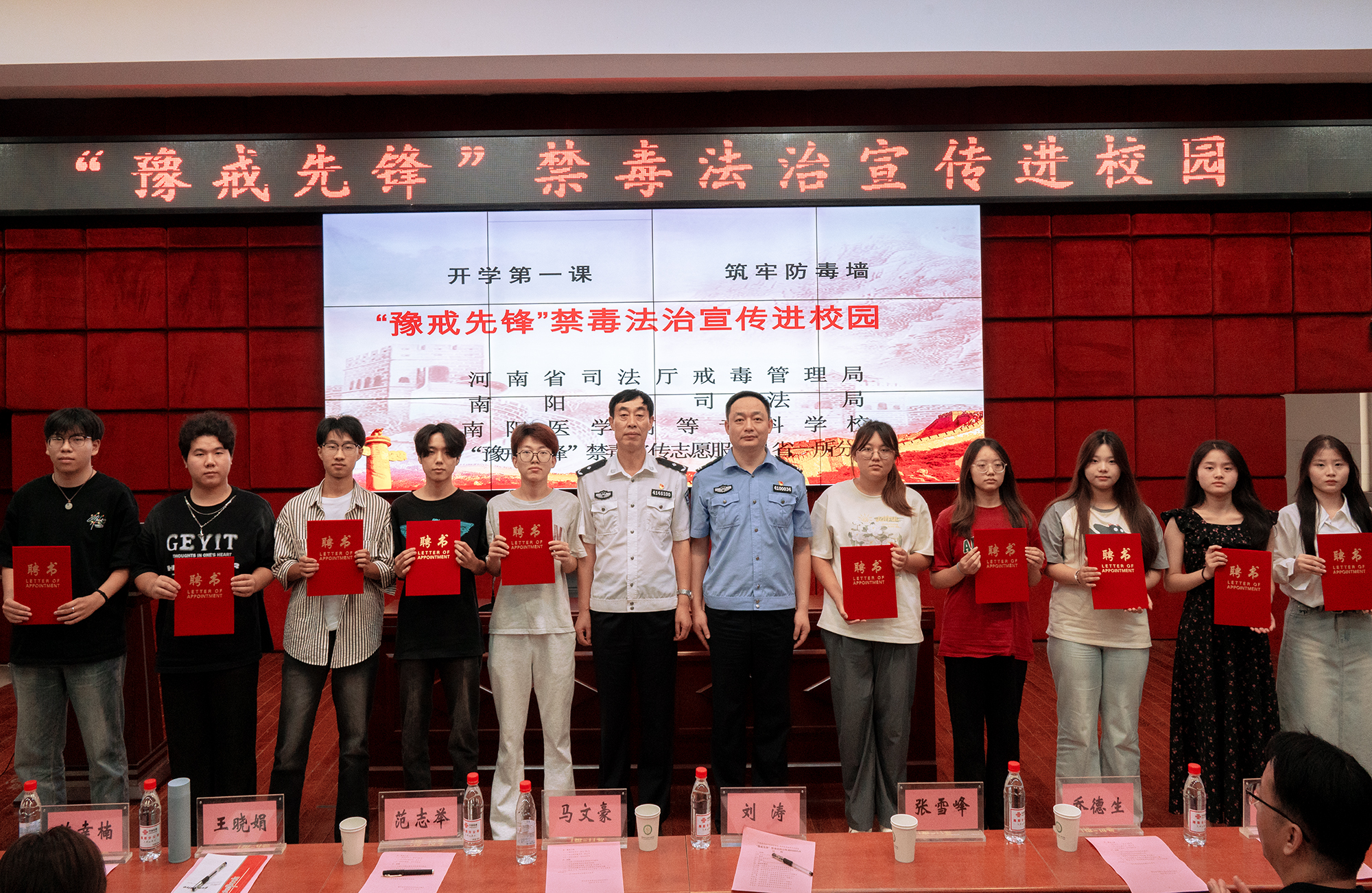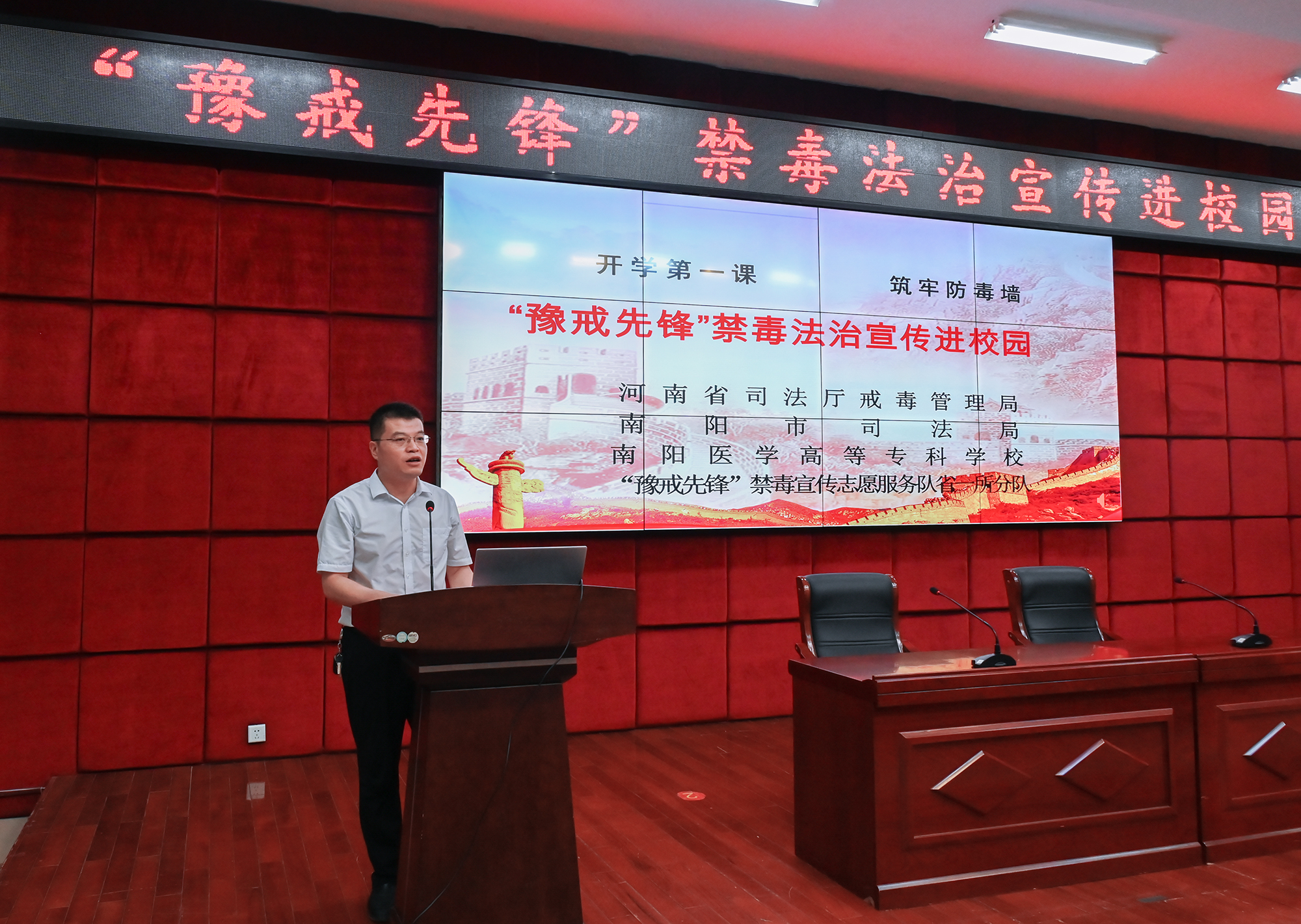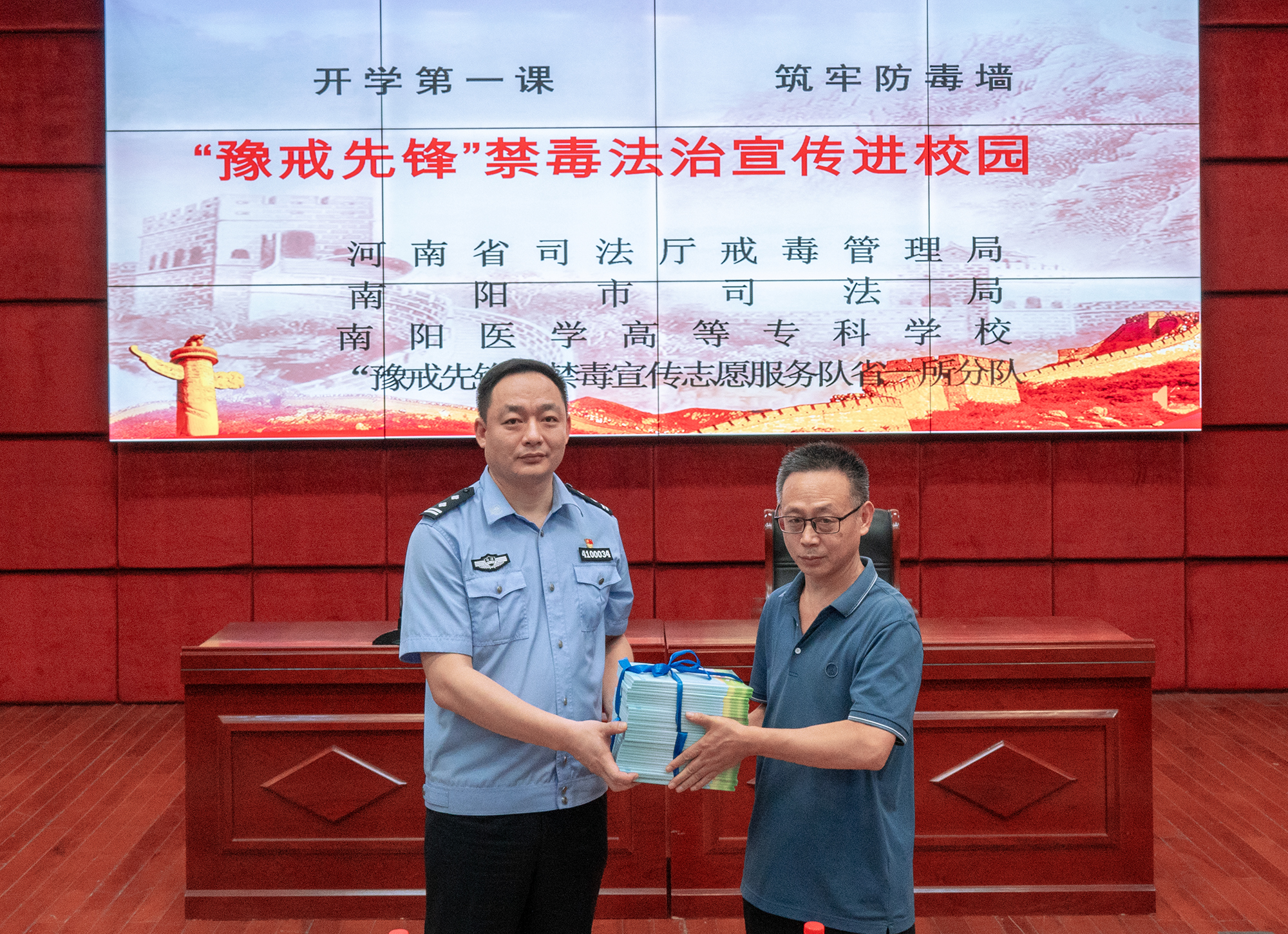 本网讯(文/法制办 刘一凡)为深入贯彻实施《中华人民共和国禁毒法》,提高广大师生的禁毒意识,在全体师生中倡导“拒绝毒品,关爱生命”的理念,提高大学生识毒、防毒、拒毒的意识和能力,9月19日,南阳医专邀请“豫戒先锋”禁毒宣传志愿服务队省一所分队走进我校,为广大师生开展禁毒宣传教育活动。南阳医专党委副书记刘涛出席活动并致欢迎辞。