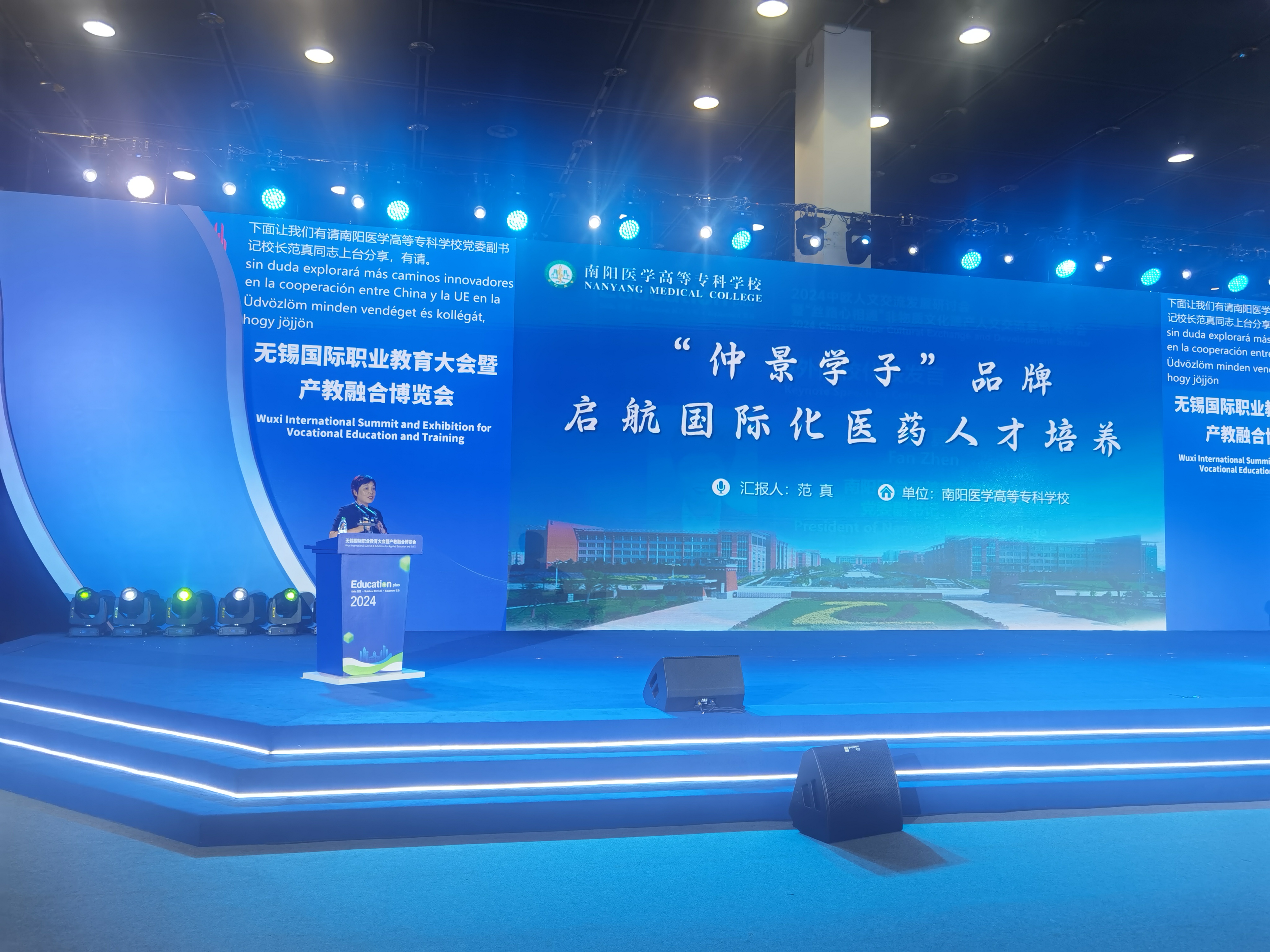 我校校长范真应邀做了题为《“仲景学子”品牌启航国际化医药人才培养》的主旨发言,从党建引领—仲景思想滋养学子精神、非遗聚火—仲景医药奠定专业根基、美美与共—仲景文化搭建交流平台、杏林飘香—仲景工坊推进职教出海四个方面,向与会代表分享我校仲景学子品牌促进国际化建设的经验做法,赢得与会代表的高度关注和一致赞誉。