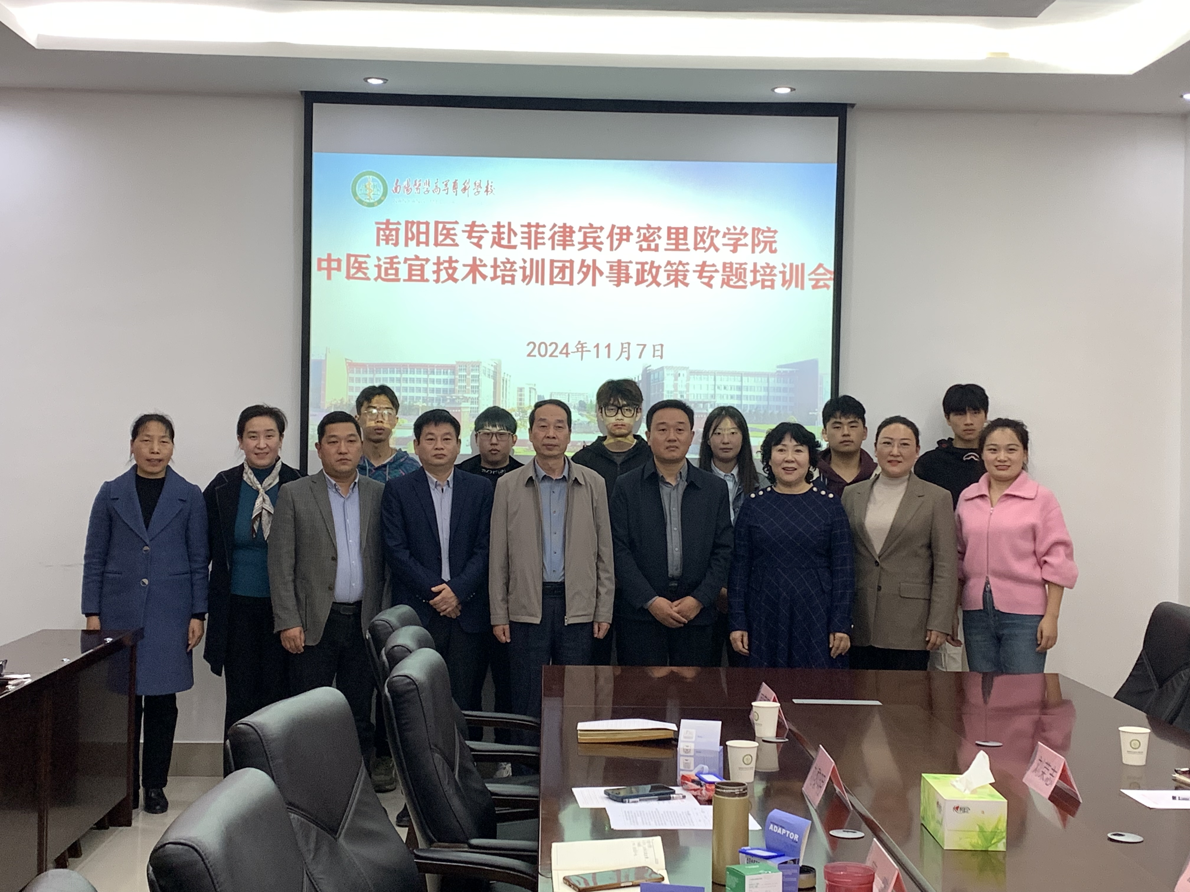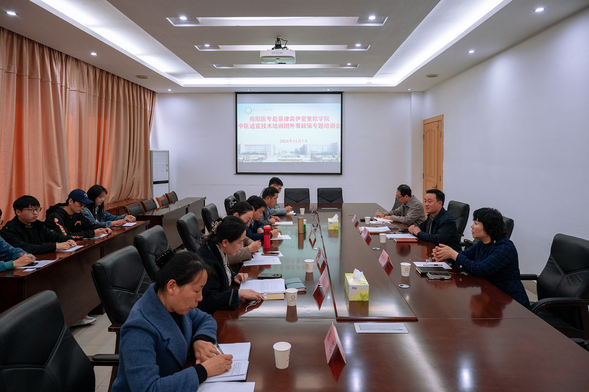 南阳市委外办出国专办员廉松霖应邀主讲,校领导刘金云、刘荣志出席,对外合作交流处、国际教育学院等部门工作人员,我校即将赴菲律宾伊密里欧学院进行中医适宜技术培训的非遗大师以及前往交流学习的学生参加。活动由国际教育学院院长徐晓杰主持。