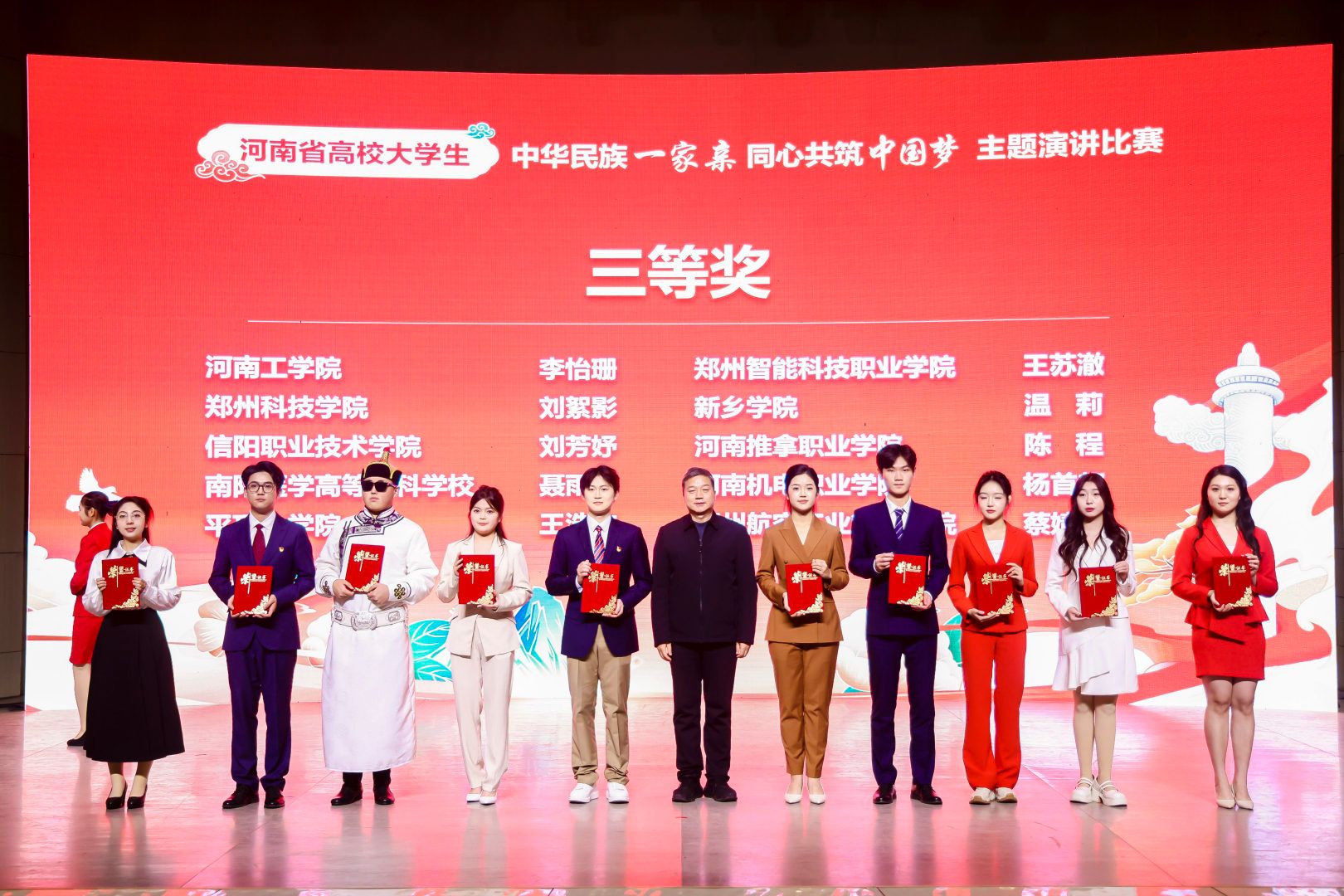 本网讯(文/统战部/李梦华 国际教育学院/张建莹)12月4日,由中共河南省委教育工委、河南省教育厅主办的全省高校大学生“中华民族一家亲 同心共筑中国梦”主题演讲比赛决赛在河南师范大学举行,我校荣获三等奖。