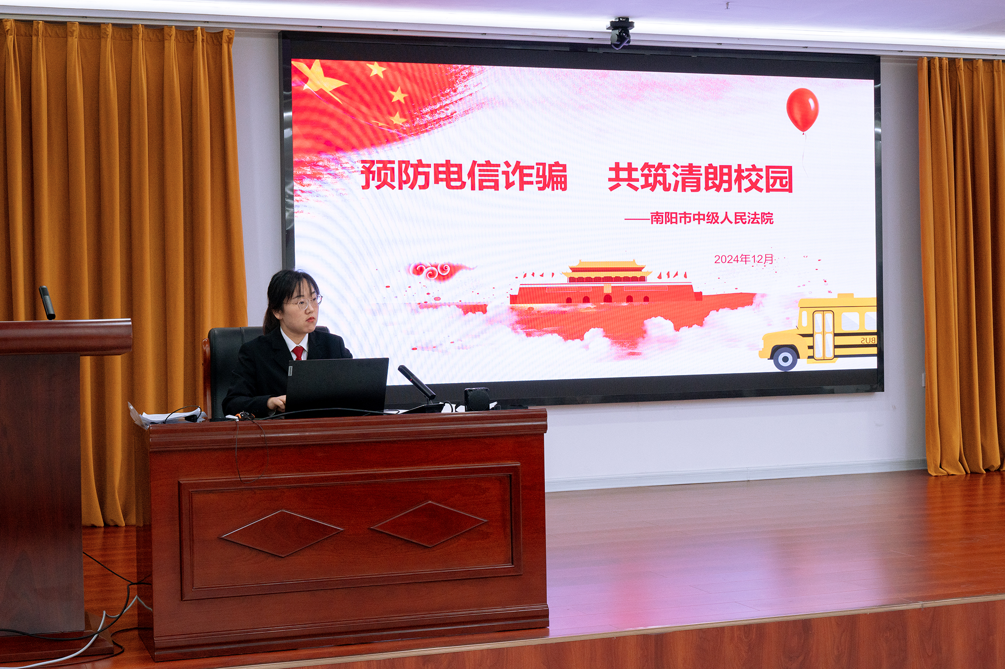 当预防校园暴力的宣讲告一段落,张雪法官适时地抛出了一个问题:“同学们,你们平时是否收到过来自陌生号码的电话或者短信,要求你转账或者提供个人信息?面对这样的情况,你们会怎么做呢?”她通过PPT展示了一系列电信诈骗的案例,详细揭露了诈骗分子的狡猾手段和惯用伎俩。她提醒学生们要保持警惕,不轻易泄露个人信息,不随意转账,遇到可疑情况要及时报警。