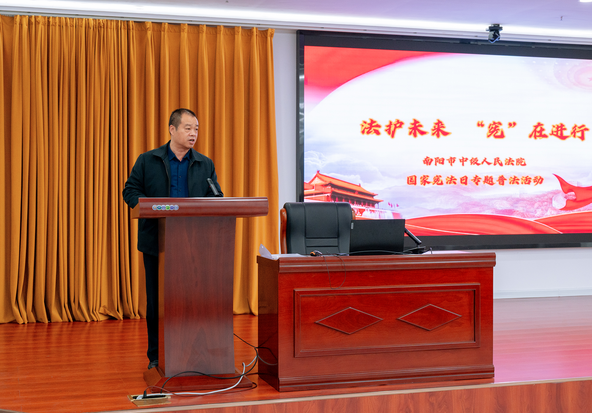 本网讯(文/法制办 张斌)为强化师生法治观念,积极推进平安校园建设,在第十一个国家宪法日来临之际,12月3日,我校邀请南阳市中级人民法院审判委员会委员、三级法官郑荣敏带领少年综合审判庭全体成员来校,开展了宪法及大学生常见涉法问题法治教育讲座。校党委委员、副校长秦玖刚致欢迎辞,法制办全体同志及各涉学系(部、院)学工办主任、辅导员代表、学生代表等300余人参加讲座。