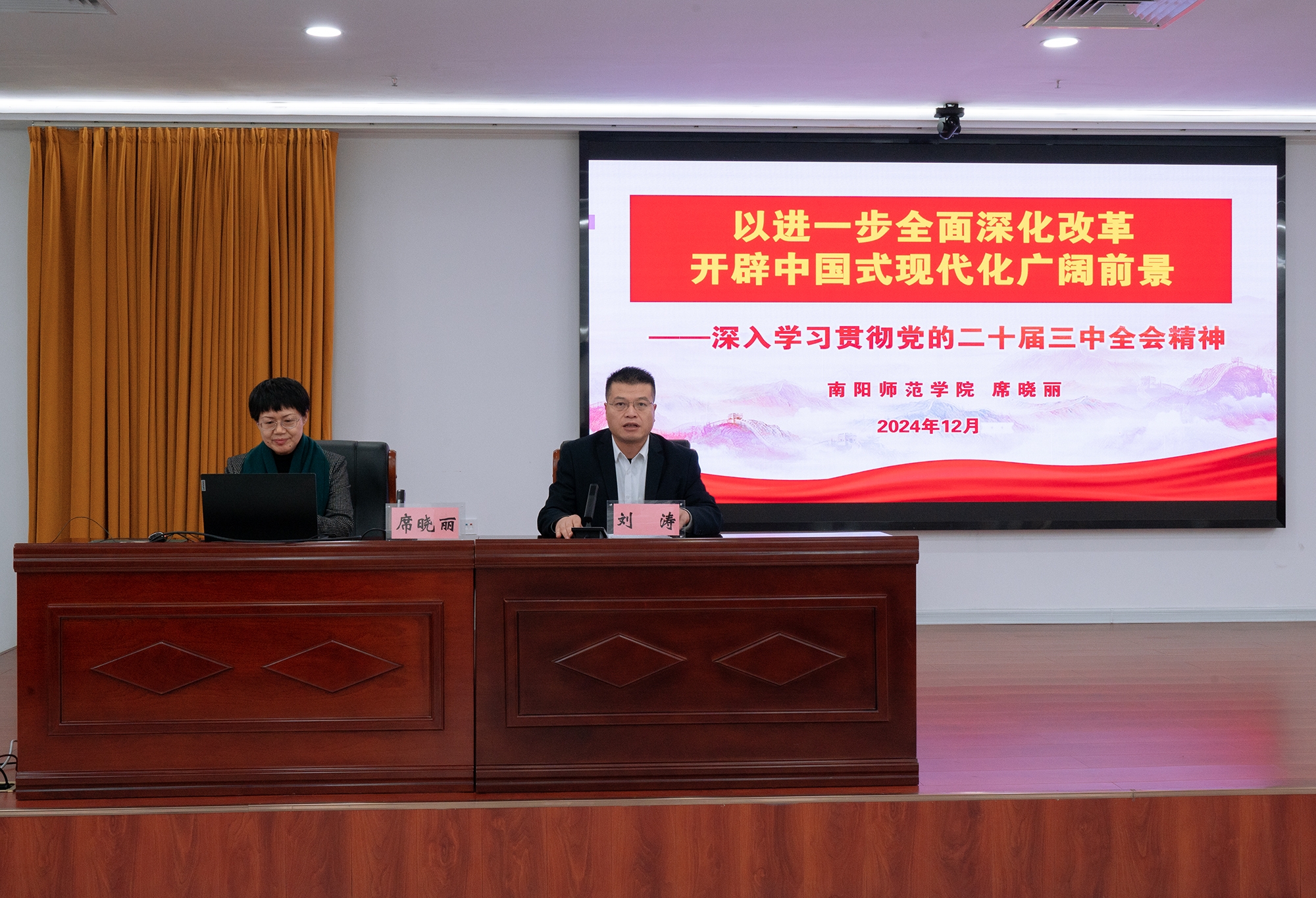 本网讯(文/宣传部 陈铁良)为全面深入学习领会党的二十届三中全会精神,使党的创新理论最新成果融入高校思想政治工作,引导广大党员干部师生更好地用党的二十届三中全会精神武装头脑、指导实践、推动工作,根据省委教育工委、省教育厅统一安排部署,12月20日,我校在仲景东区仲景文化中心7楼报告厅举办党的二十届三中全会精神宣讲会,省委教育工委宣讲团成员、南阳师范学院党委宣传部部长席晓丽向我校师生宣讲党的二十届三中全会精神。学校中层正副职干部、全体思政课教师及学生代表共300余人参加会议。校党委副书记刘涛主持会议。