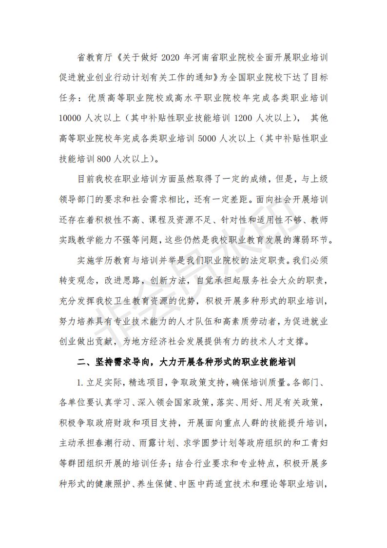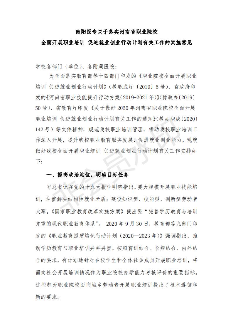 南阳医专关于落实河南省职业院校全面开展职业培训 促进就业创业行动计划有关工作的实施意见